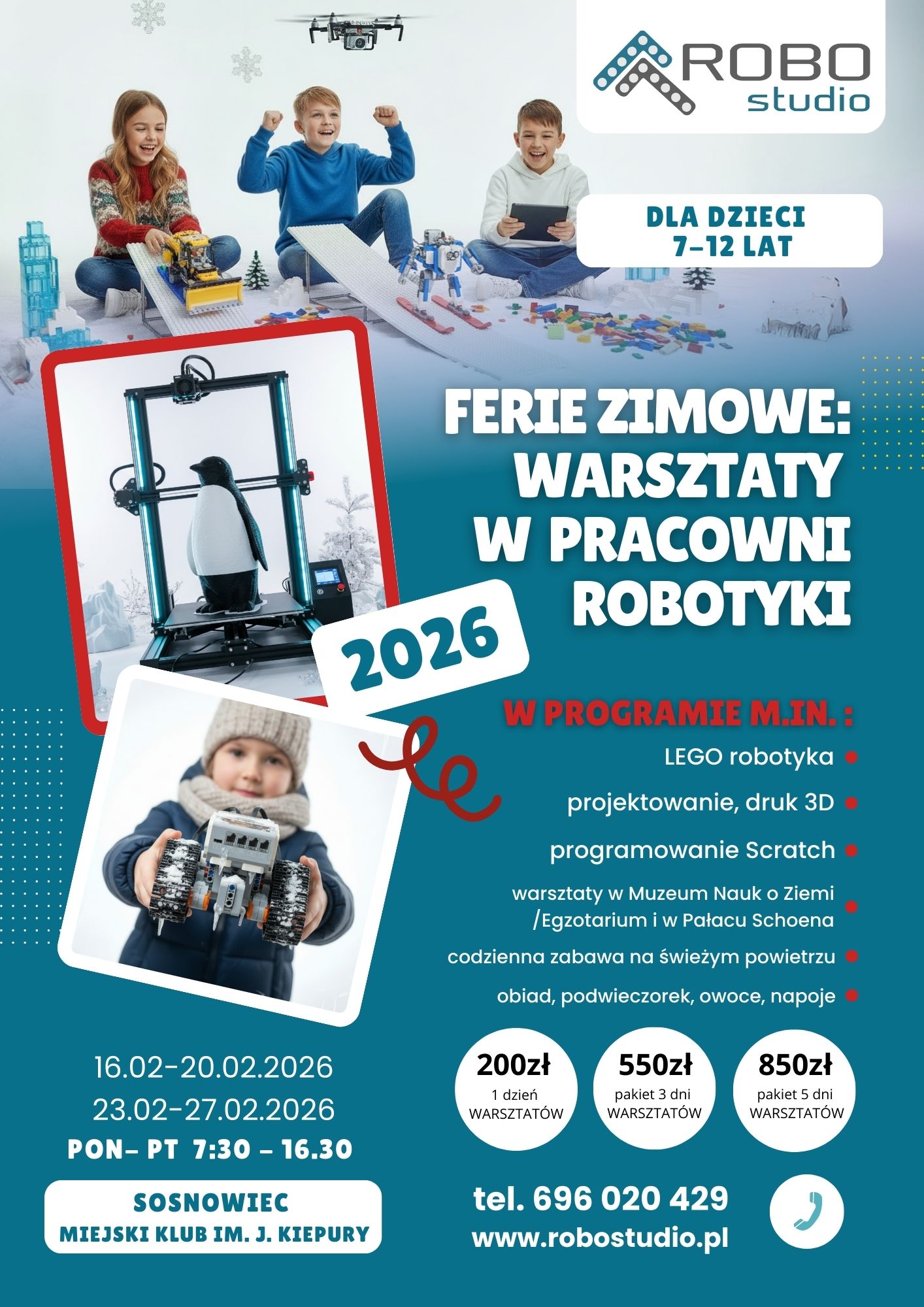 9.00- 15.00 Trzy bloki warsztatów (np: robotyka, druk 3D, programowanie Scratch, spacer/wycieczka), obiad, podwieczorek